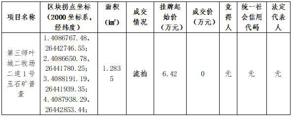 新疆公信拍卖有限公司受新疆生产建设兵团第三师自然资源和规划局委托,于2025年8月12日在新疆生产建设兵团公共资源交易信息网(https://ggzy.xjbt.gov.cn/)发布了《第三师叶城二牧场二连1号玉石矿普查探矿权挂牌出让公告》(师市自然资告〔2025〕2号),根据《矿业权交易规则》等有关规定,现对该探矿权出让有关事项进行公示如下: