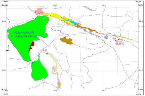 8.矿区位置:矿区处于阿尔泰山脉南麓准噶尔盆地北缘,均为近现代戈壁,由砾石、砂、泥组成,地势开阔,起伏不大,南高,北低,相对高差小。地貌类型为平原地貌以微斜坡地貌、洪积平原丘陵为主,干旱少雨,无地表水体。区内较大河流有额尔齐斯河,是我国唯一注入北冰洋的河流,年流量达1.01×1010立方米,水质良好,适合人畜饮用。