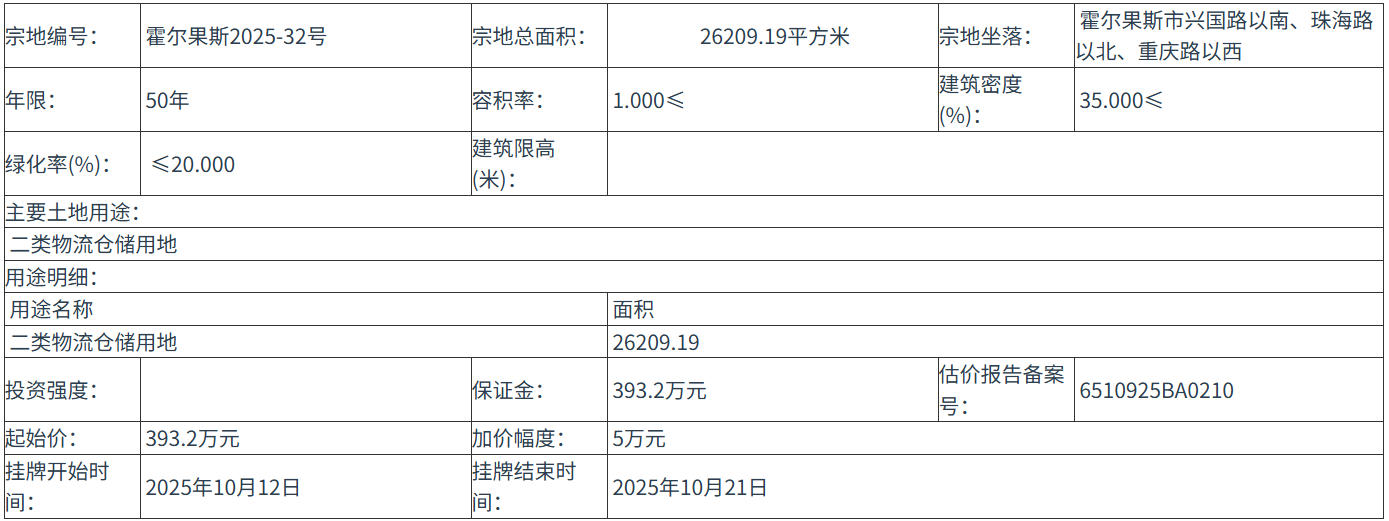 霍尔果斯2025-32号 号地块:2025年10月12日 10时00分 至 2025年10月21日 19时00分;