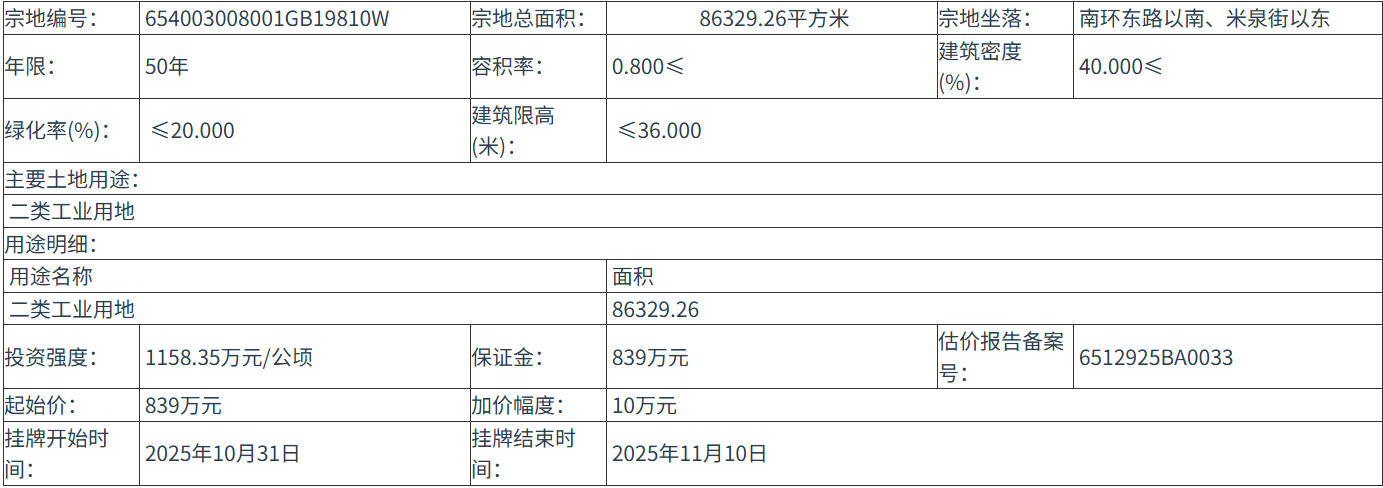 654003008001GB19810W 号地块:2025年10月31日 12时00分 至 2025年11月10日 12时00分;