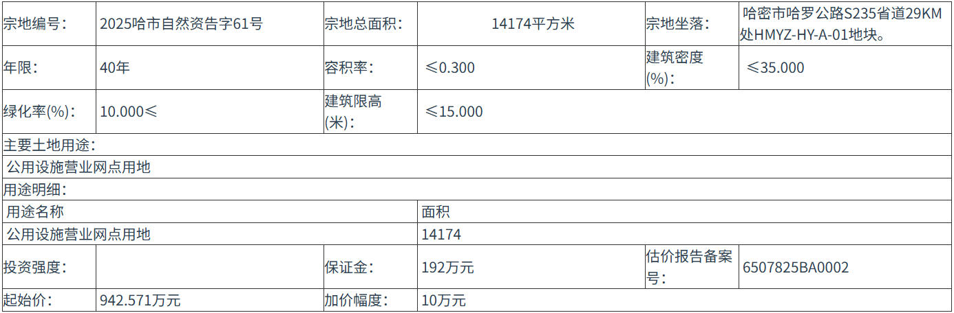 四、 本次拍卖出让的详细资料和具体要求,见拍卖出让文件。申请人可于 2025年10月15日 至 2025年11月03日 到 哈密市天山西路6号 获取 拍卖出让 文件。