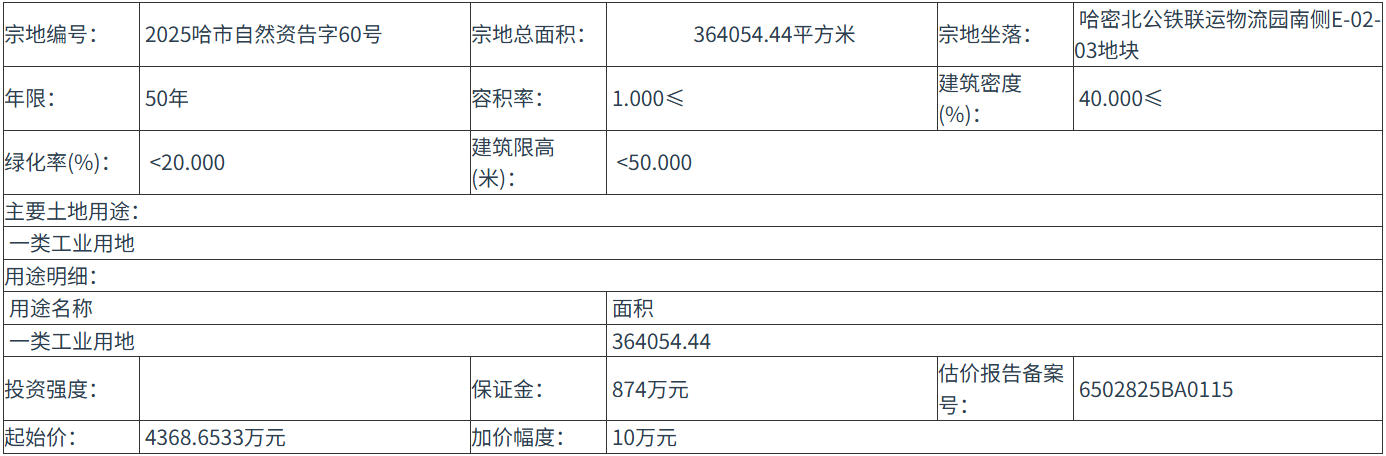 四、 本次拍卖出让的详细资料和具体要求,见拍卖出让文件。申请人可于 2025年10月15日 至 2025年11月03日 到 哈密市天山西路6号 获取 拍卖出让 文件。