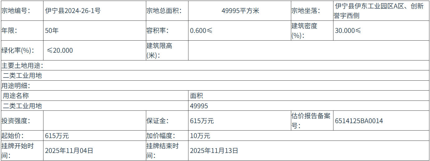 伊宁县2024-26-1号 号地块:2025年11月04日 12时00分 至 2025年11月13日 12时00分;