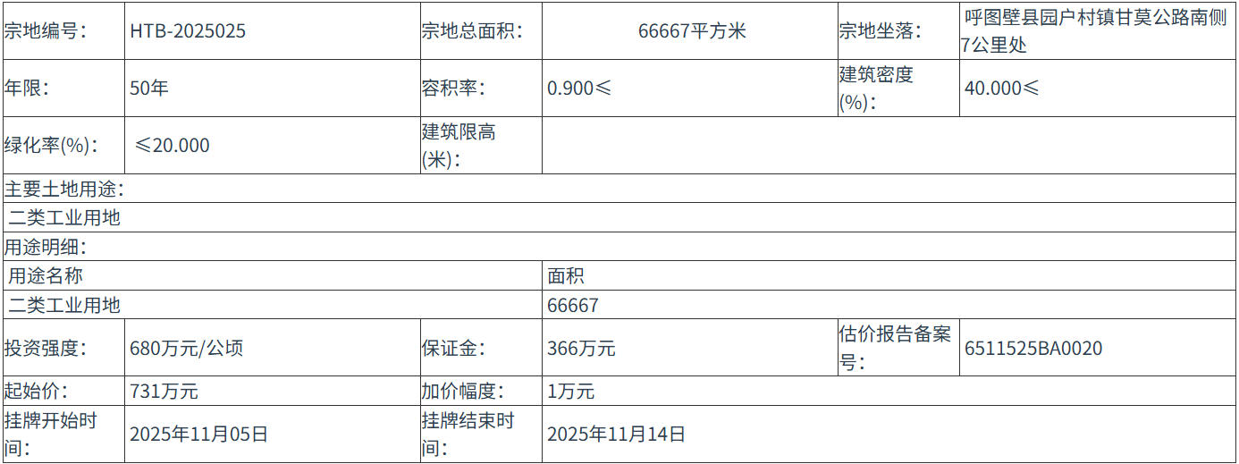 HTB-2025025 号地块:2025年11月05日 10时00分 至 2025年11月14日 18时00分;