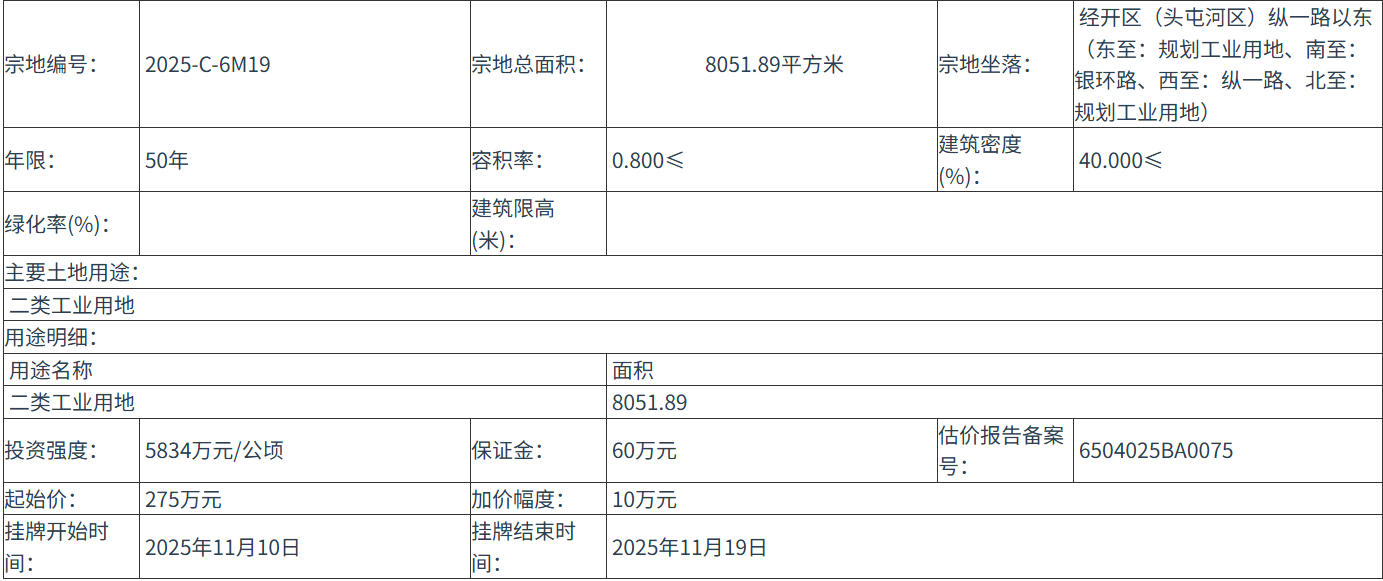 2025-C-6M19 号地块:2025年11月10日 11时00分 至 2025年11月19日 16时00分;