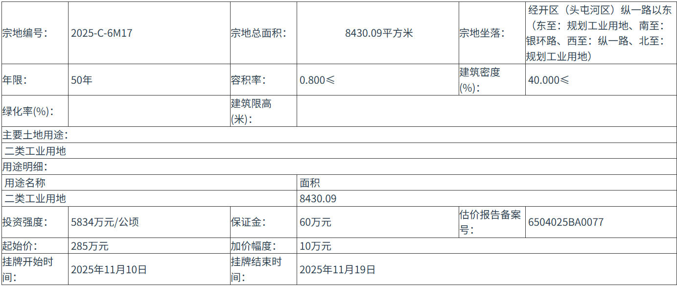 2025-C-6M17 号地块:2025年11月10日 11时00分 至 2025年11月19日 16时00分;