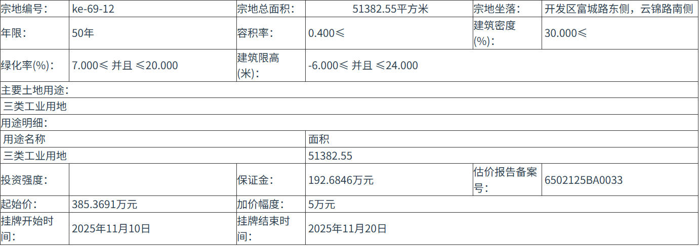ke-69-12 号地块:2025年11月10日 10时00分 至 2025年11月20日 12时00分;
