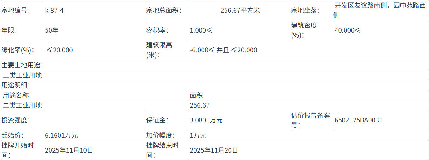 k-87-4 号地块:2025年11月10日 10时00分 至 2025年11月20日 12时00分;