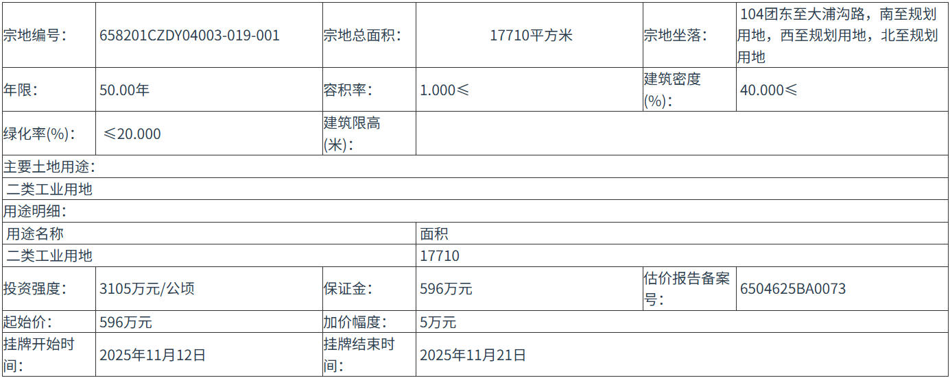 658201CZDY04003-019-001 号地块:2025年11月12日 11时00分 至 2025年11月21日 17时00分;