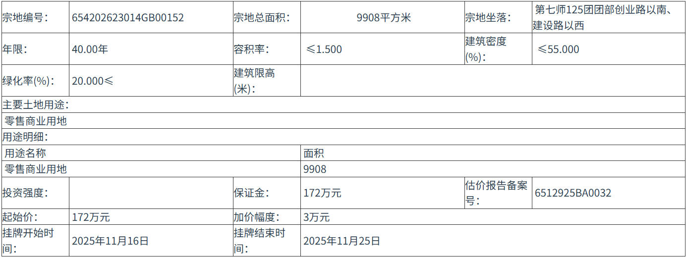 654202623014GB00152 号地块:2025年11月16日 12时00分 至 2025年11月25日 12时00分;
