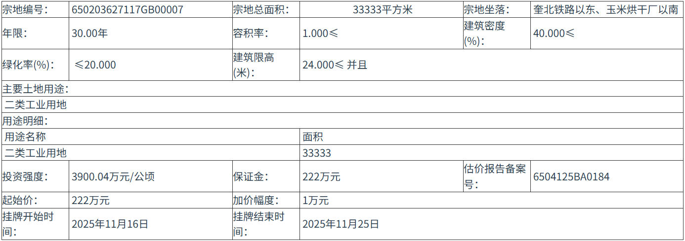 650203627117GB00007 号地块:2025年11月16日 12时00分 至 2025年11月25日 12时00分;
