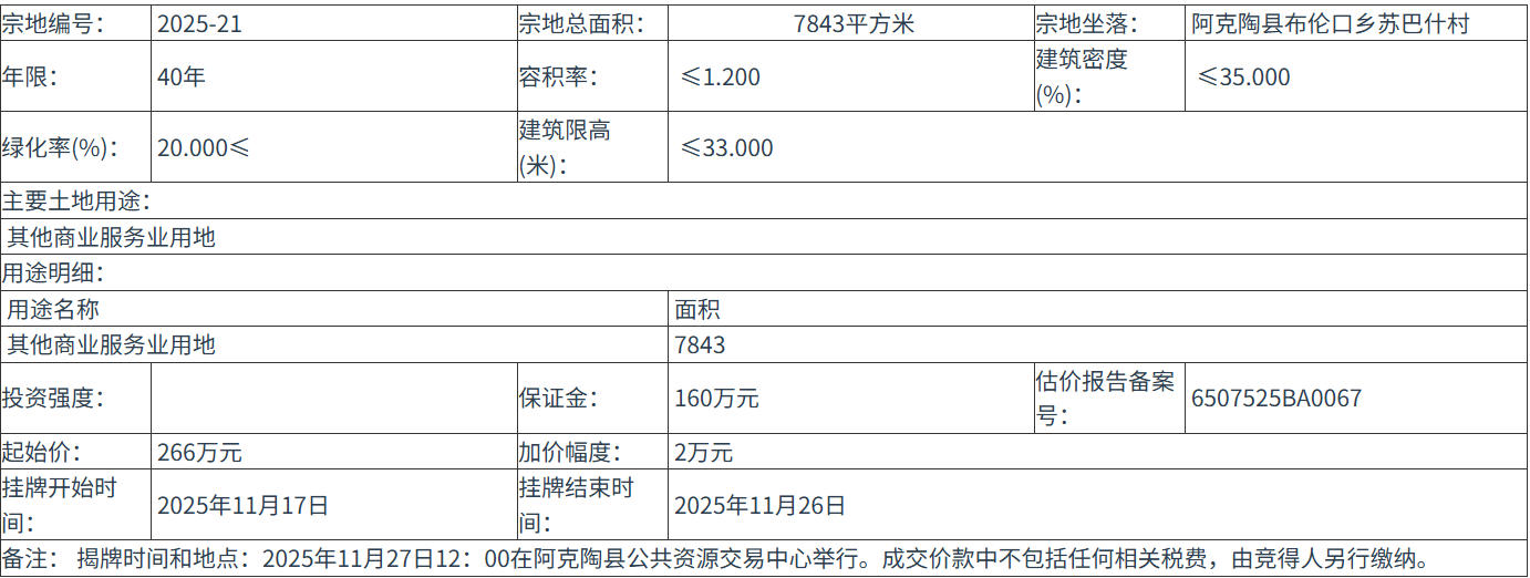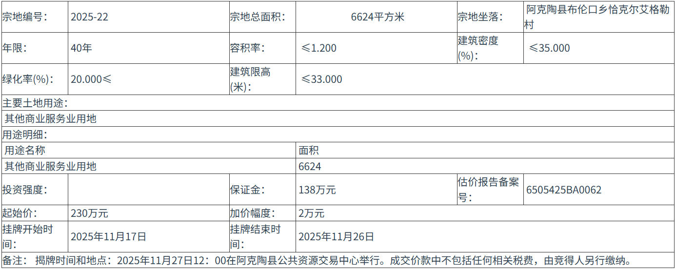 六、本次国有土地使用权挂牌活动 在 阿克陶县公共资源交易中心 进行。各地块挂牌时间分别为: