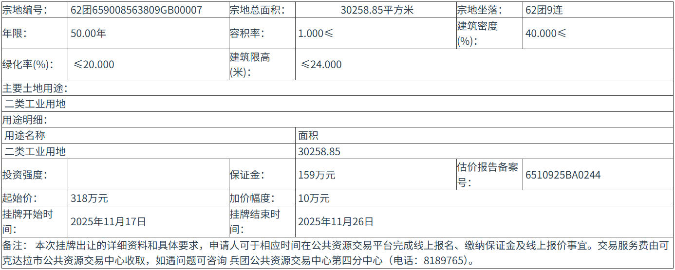 四、 本次挂牌出让的详细资料和具体要求,见挂牌出让文件。申请人可于 2025年10月28日 至 2025年11月24日 到 兵团公共资源交易中心第四分中心(可克达拉市政务服务中心四楼) 获取 挂牌出让 文件。