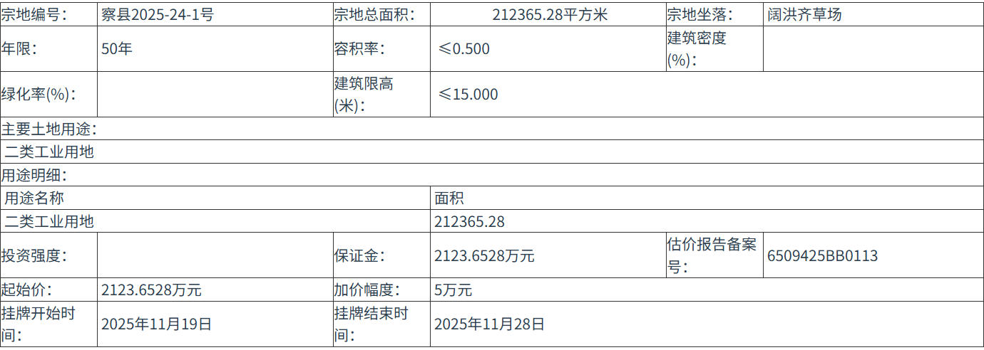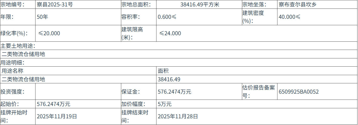 四、 本次挂牌出让的详细资料和具体要求,见挂牌出让文件。申请人可于 2025年10月30日 至 2025年11月18日 到 察布查尔县土地收购储备中心 获取 挂牌出让 文件。