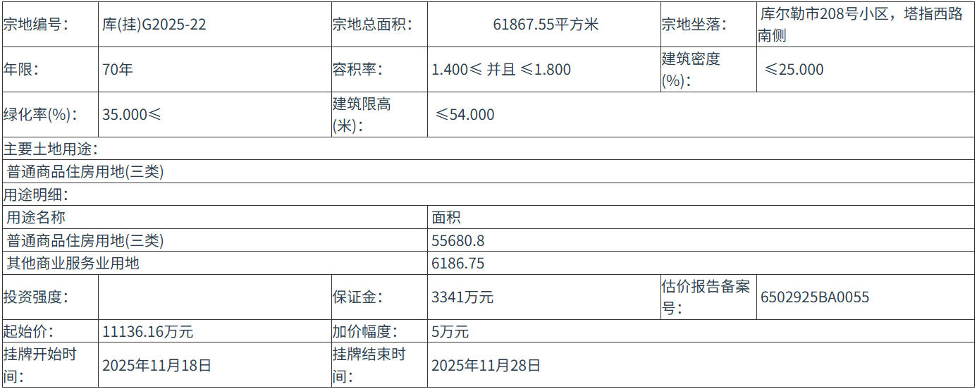 四、 本次挂牌出让的详细资料和具体要求,见挂牌出让文件。申请人可于 2025年10月29日 至 2025年11月17日 到 库尔勒市索克巴格路巴州住建大厦11楼1118室 获取 挂牌出让 文件。
