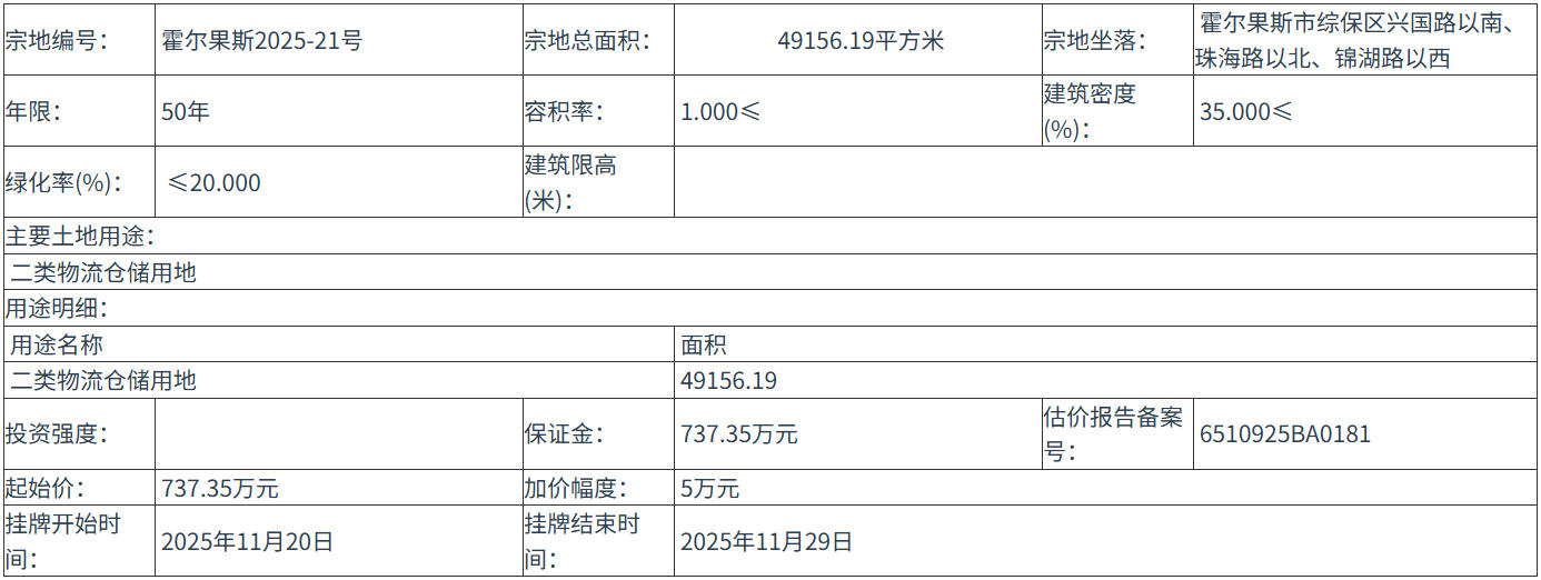 霍尔果斯2025-21号 号地块:2025年11月20日 10时00分 至 2025年11月29日 19时00分;