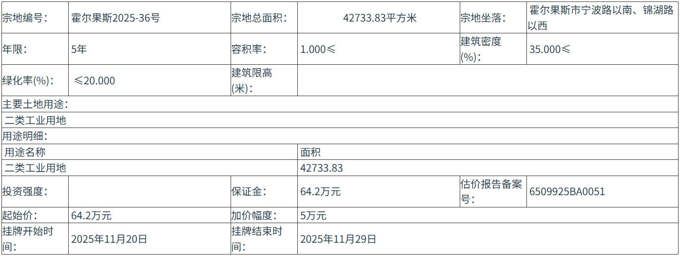 霍尔果斯2025-36号 号地块:2025年11月20日 10时00分 至 2025年11月29日 19时00分;