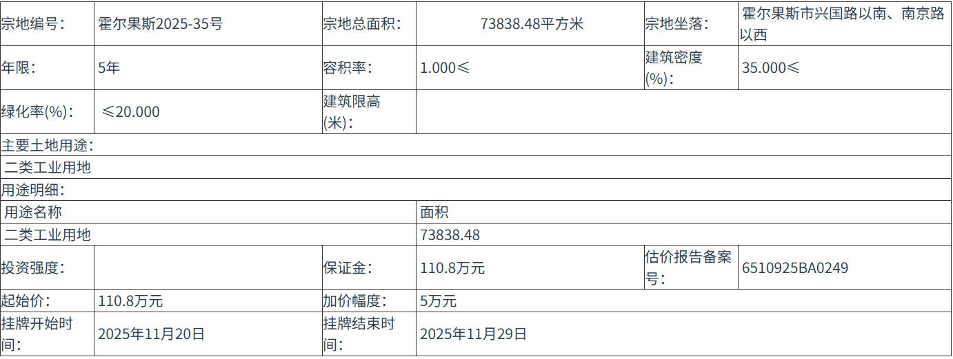 霍尔果斯2025-35号 号地块:2025年11月20日 10时00分 至 2025年11月29日 19时00分;
