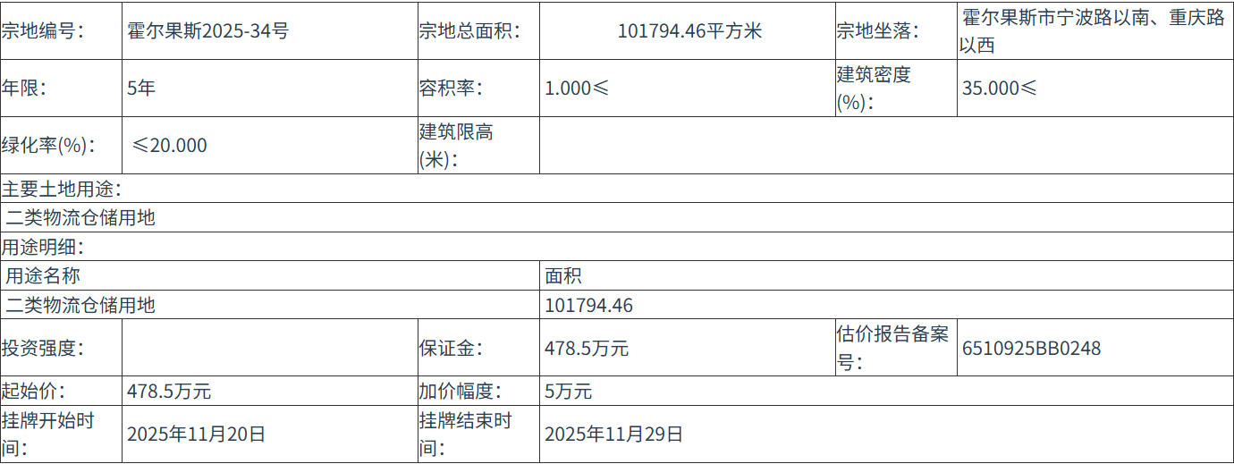 霍尔果斯2025-34号 号地块:2025年11月20日 10时00分 至 2025年11月29日 19时00分;