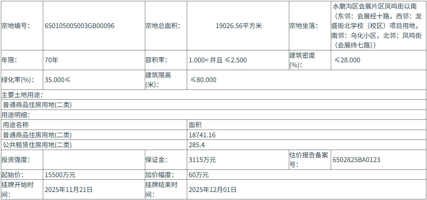 650105005003GB00096 号地块:2025年11月21日 11时00分 至 2025年12月01日 16时00分;