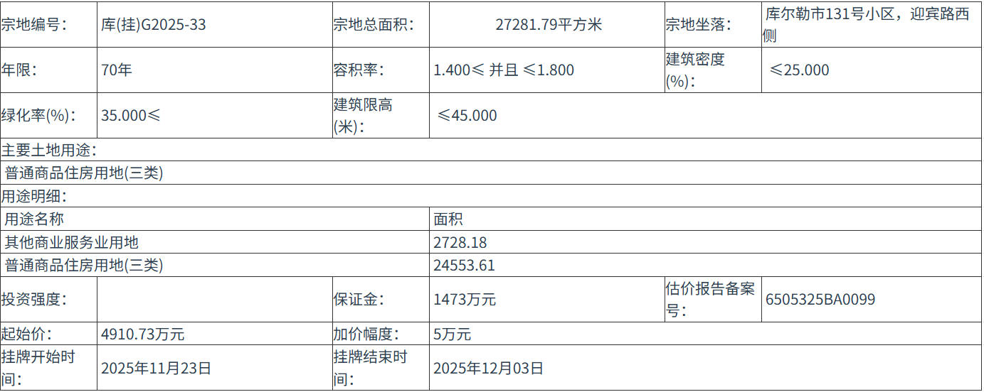六、本次国有土地使用权挂牌活动 在 库尔勒市索克巴格路巴州住建大厦11楼1118室 进行。各地块挂牌时间分别为: