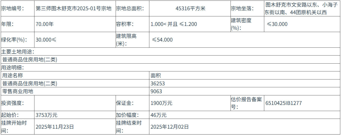 第三师图木舒克市2025-01号宗地 号地块:2025年11月23日 10时00分 至 2025年12月02日 19时00分;