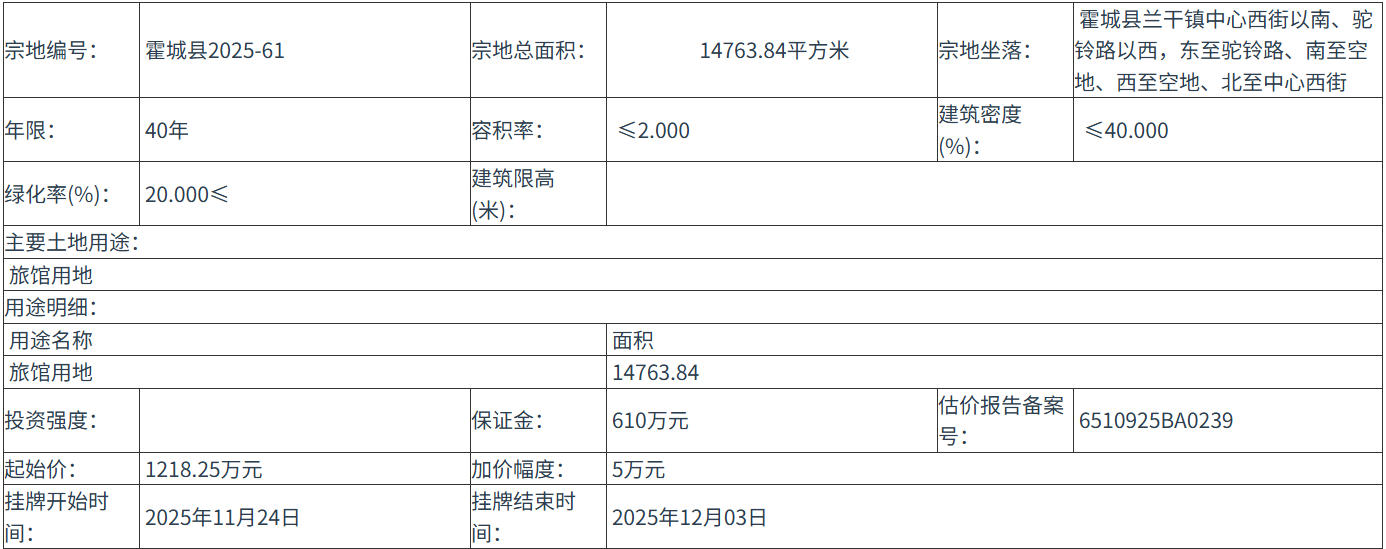 霍城县2025-61 号地块:2025年11月24日 10时00分 至 2025年12月03日 11时00分;