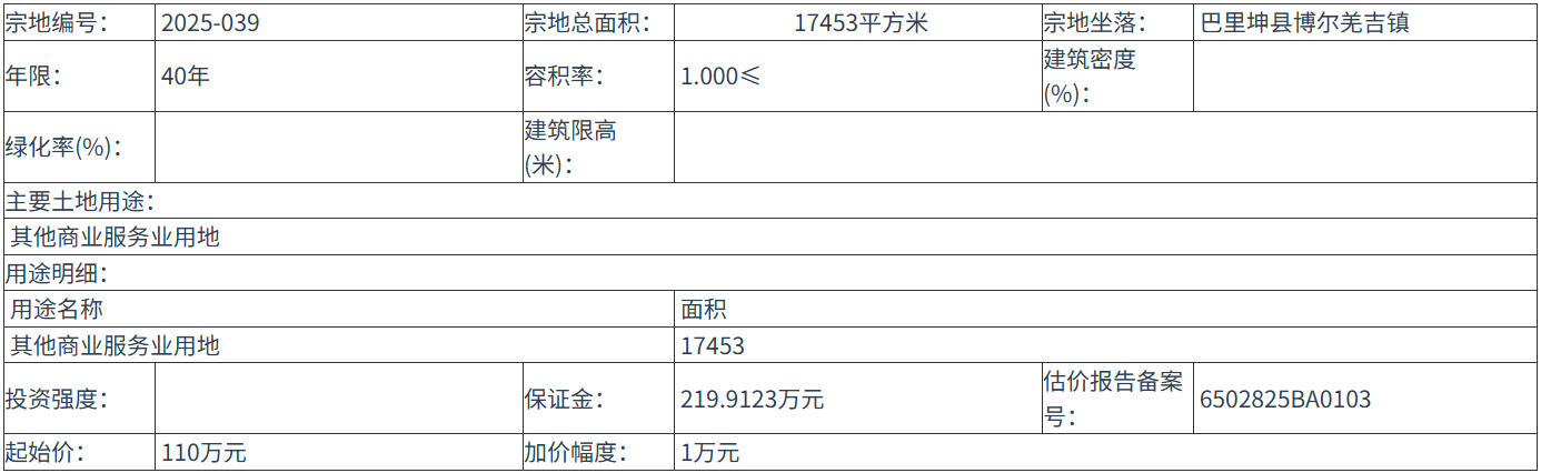 经巴里坤哈萨克自治县人民政府批准,巴里坤县自然资源局决定以 拍卖出让 方式 1(幅) 地块的国有土地使用权。现将有关事项公告如下: