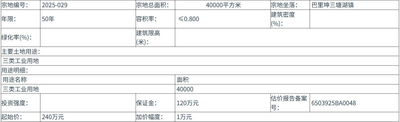 经巴里坤哈萨克自治县人民政府批准,巴里坤县自然资源局决定以 拍卖出让 方式 1(幅) 地块的国有土地使用权。现将有关事项公告如下: