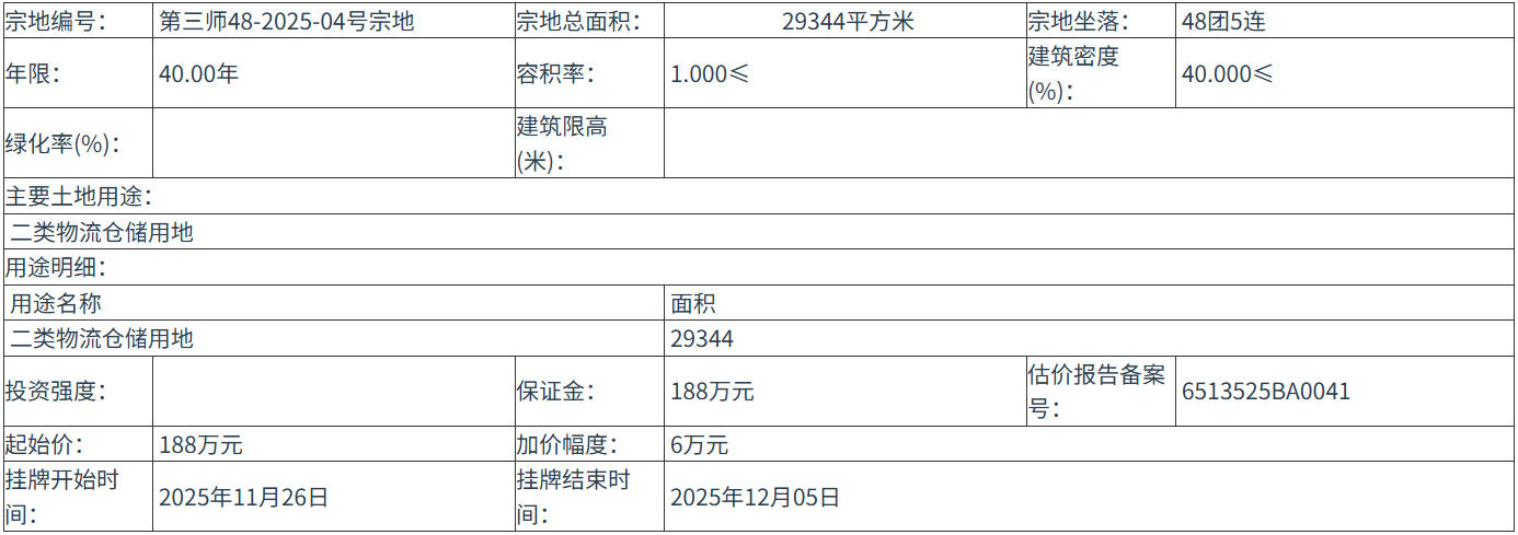 第三师48-2025-04号宗地 号地块:2025年11月26日 10时00分 至 2025年12月05日 19时00分;