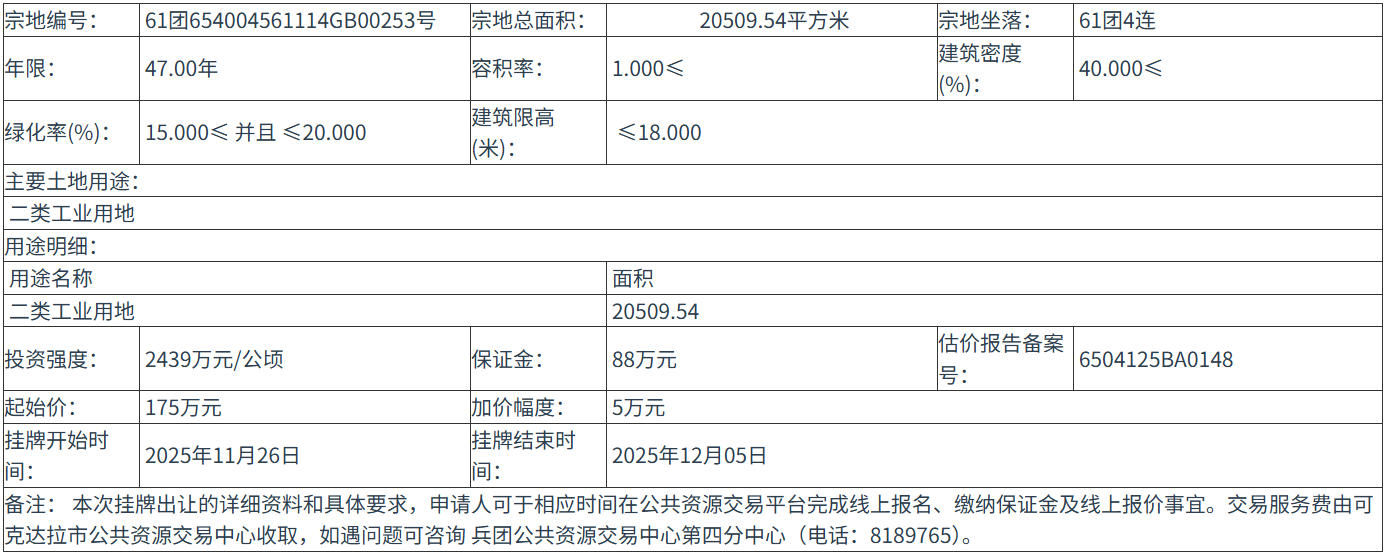 61团654004561114GB00253号 号地块:2025年11月26日 10时00分 至 2025年12月05日 18时00分;