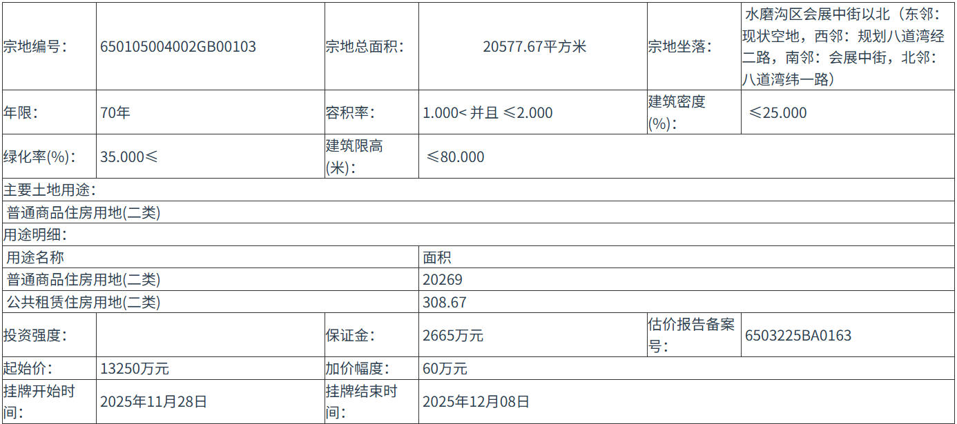 650105004002GB00103 号地块:2025年11月28日 11时00分 至 2025年12月08日 16时00分;