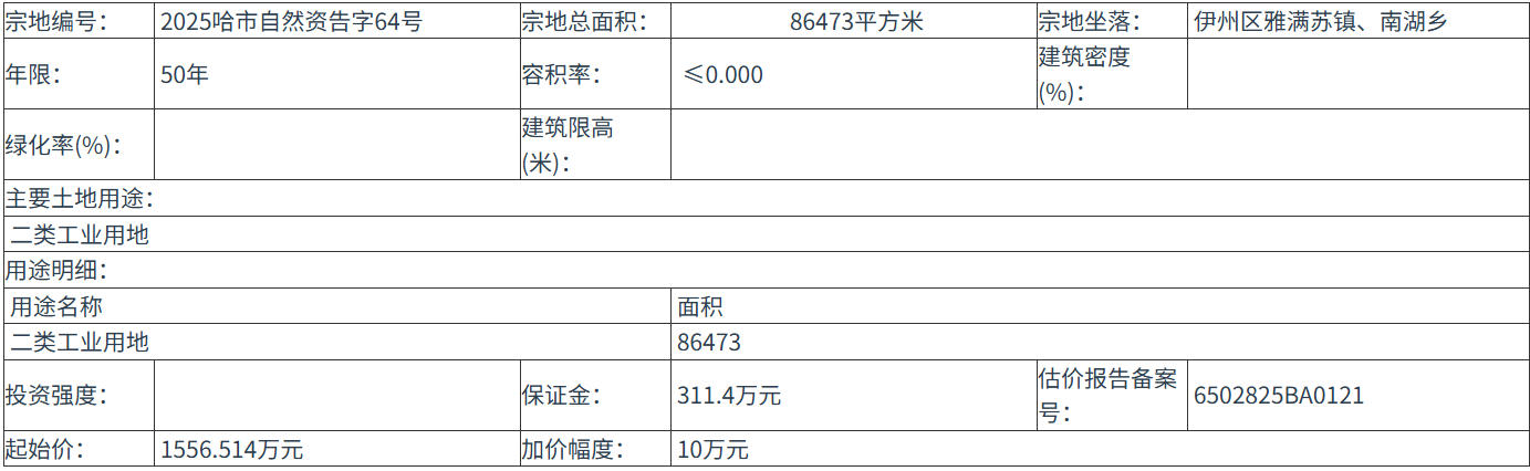 四、 本次拍卖出让的详细资料和具体要求,见拍卖出让文件。申请人可于 2025年11月11日 至 2025年11月30日 到 哈密市天山西路6号 获取 拍卖出让 文件。