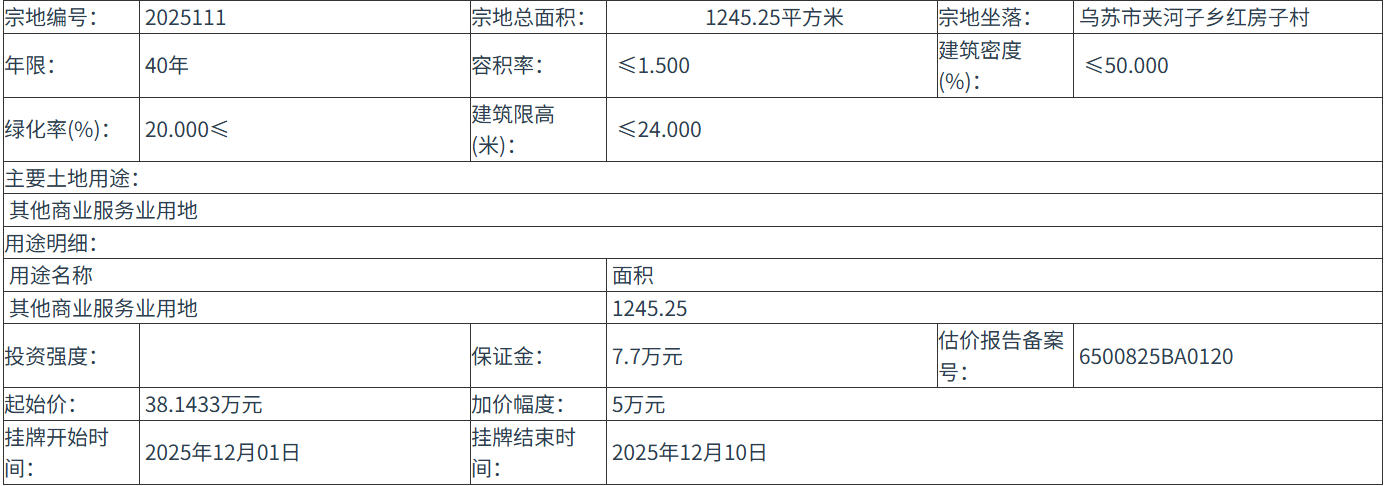 四、 本次挂牌出让的详细资料和具体要求,见挂牌出让文件。申请人可于 2025年11月11日 至 2025年11月30日 到 乌苏市自然资源局 获取 挂牌出让 文件。