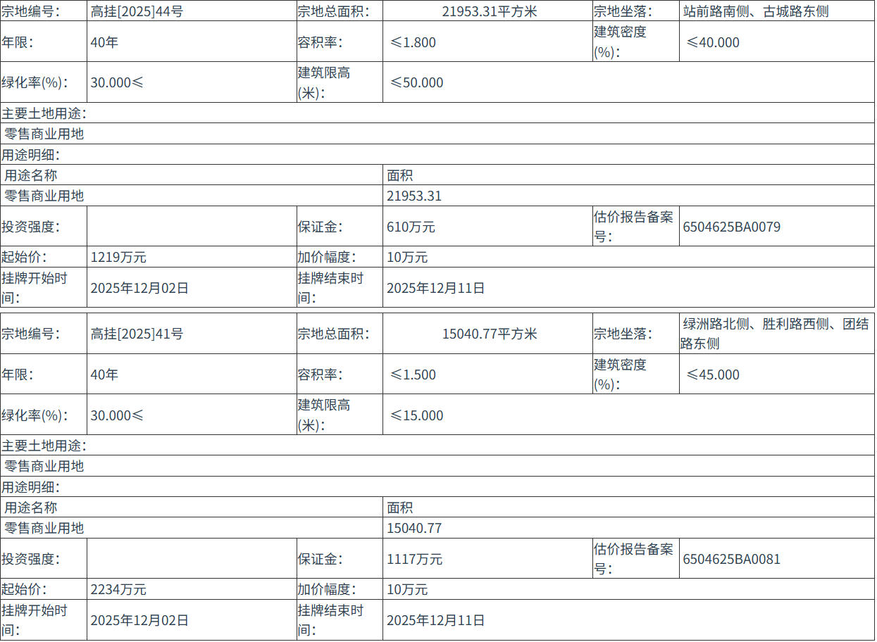 高挂[2025]41号 号地块:2025年12月02日 10时00分 至 2025年12月11日 16时00分;