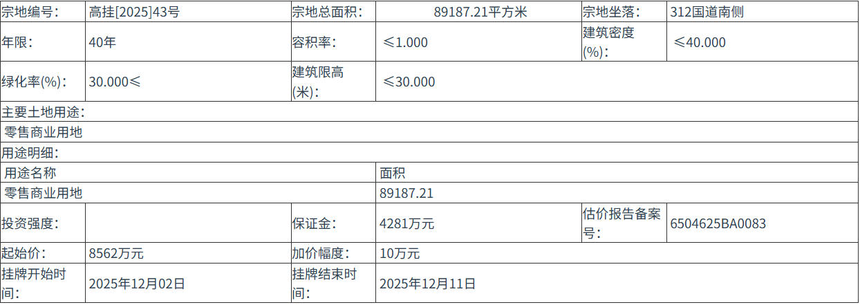 高挂[2025]43号 号地块:2025年12月02日 10时00分 至 2025年12月11日 16时00分;