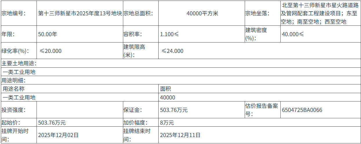 第十三师新星市2025年度13号地块 号地块:2025年12月02日 10时00分 至 2025年12月11日 11时30分;