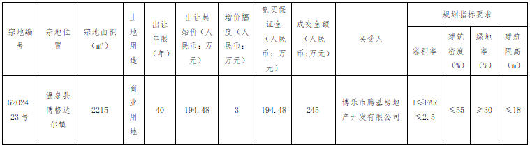 根据《中华人民共和国土地管理法》《中华人民共和国拍卖法》《中华人民共和国城镇国有土地使用权出让和转让暂行条例》(国务院令第55号)《招标拍卖挂牌出让国有建设用地使用权规定》(国土资源部令第39号)等有关法律法规及文件规定,经温泉县人民政府批准,温泉县自然资源局委托新疆国源土地矿产资源交易中心以拍卖方式出让1宗国有建设用地使用权,现将交易结果公示如下: