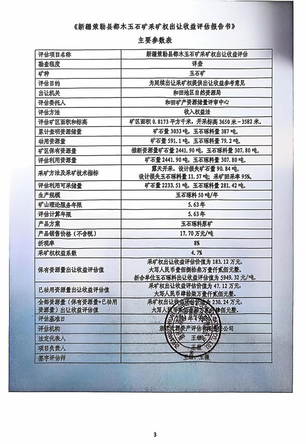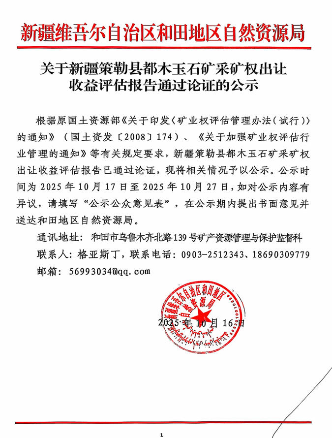 关于新疆策勒县都木玉石矿采矿权出让收益评估报告通过论证的公示