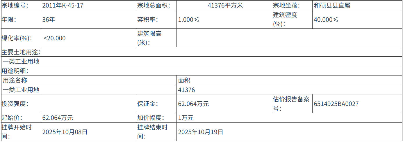 四、 本次挂牌出让的详细资料和具体要求,见挂牌出让文件。申请人可于 2025年09月18日 至 2025年10月07日 到 和硕县自然资源局 获取 挂牌出让 文件。