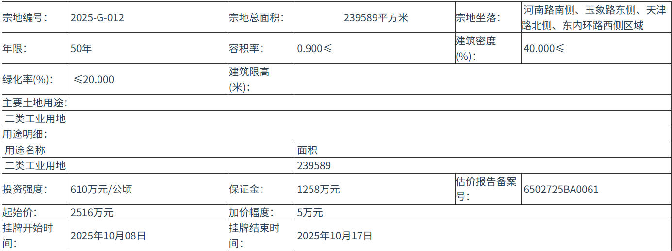 2025-G-012 号地块:2025年10月08日 10时00分 至 2025年10月17日 17时00分;