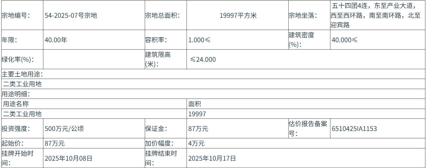 四、 本次挂牌出让的详细资料和具体要求,见挂牌出让文件。申请人可于 2025年09月18日 至 2025年10月15日 到 第三师自然资源和规划局 获取 挂牌出让 文件。