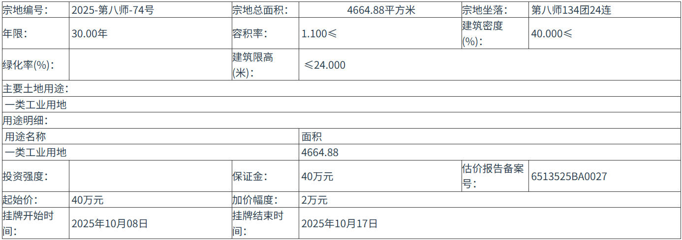 2025-第八师-74号 号地块:2025年10月08日 10时00分 至 2025年10月17日 17时00分;