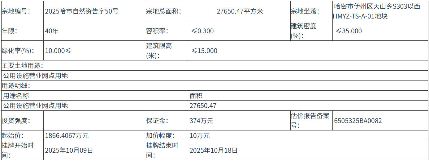 四、 本次挂牌出让的详细资料和具体要求,见挂牌出让文件。申请人可于2025年09月19日至2025年10月08日到哈密市天山西路6号获取挂牌出让 文件。