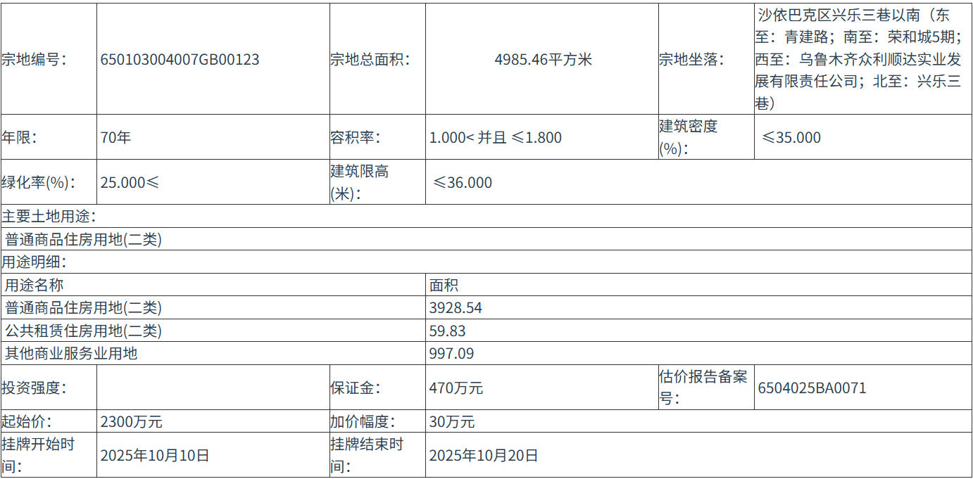 650103004007GB00123 号地块:2025年10月10日 11时00分 至 2025年10月20日 16时00分;