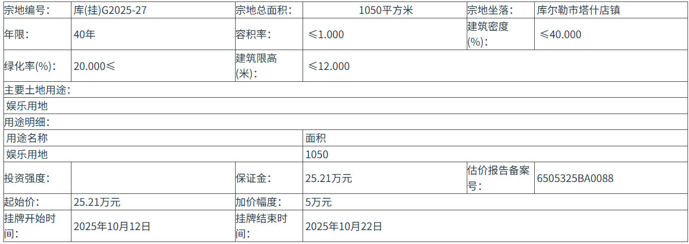 库(挂)G2025-27 号地块:2025年10月12日 10时00分 至 2025年10月22日 12时00分;