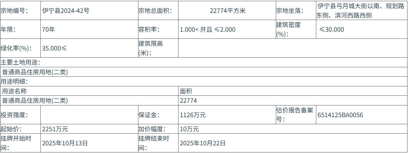 伊宁县2024-42号 号地块:2025年10月13日 12时00分 至 2025年10月22日 12时00分;