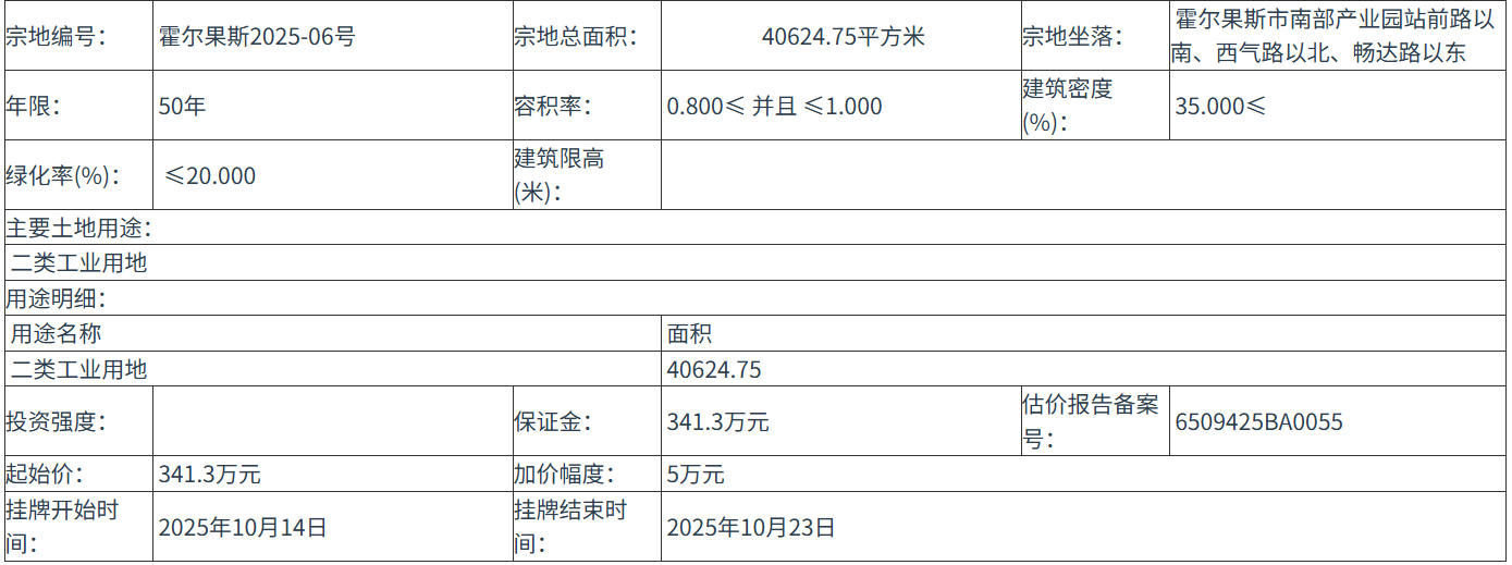 霍尔果斯2025-06号 号地块:2025年10月14日 10时00分 至 2025年10月23日 19时00分;