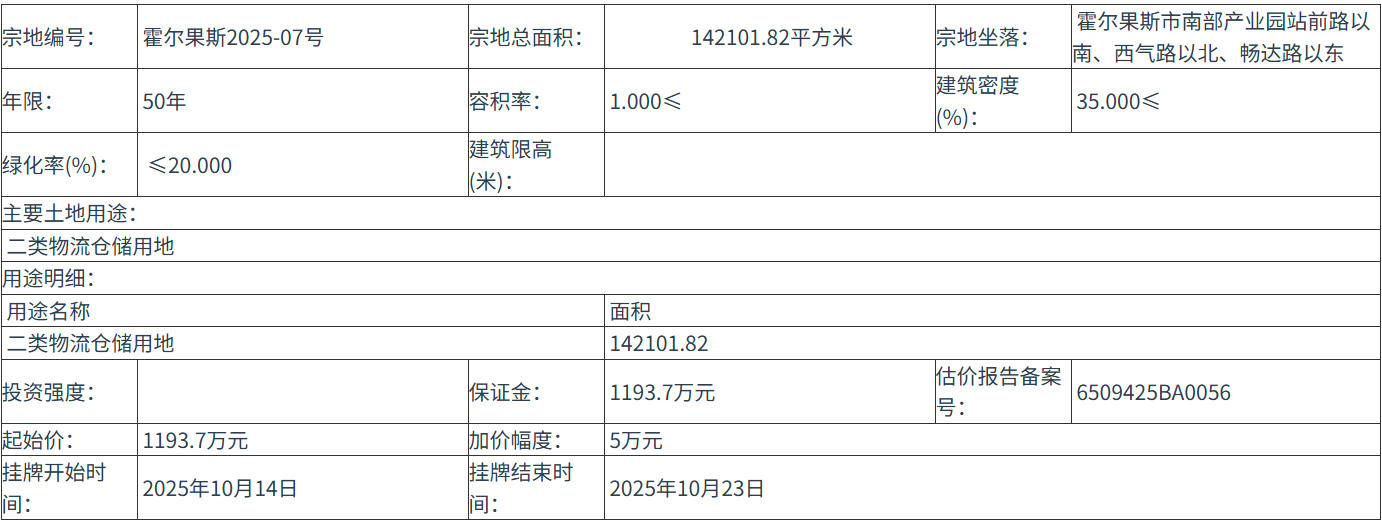 霍尔果斯2025-07号 号地块:2025年10月14日 10时00分 至 2025年10月23日 19时00分;