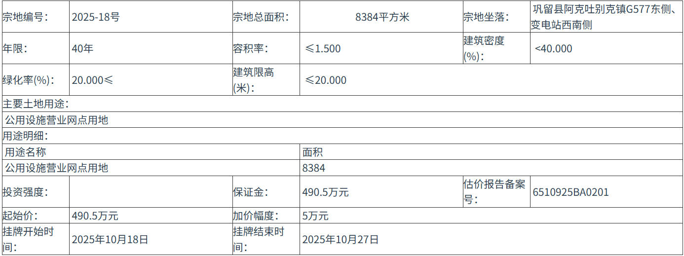四、 本次挂牌出让的详细资料和具体要求,见挂牌出让文件。申请人可于 2025年09月27日 至 2025年10月17日 到 巩留县自然资源局开发利用和国土空间用途管制科 获取 挂牌出让 文件。